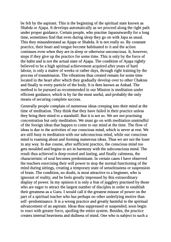 be felt by the aspirant. This is the beginning of the spiritual state known as Shabda or Ajapa. It develops automatically as we proceed along the right path under proper guidance. Certain people, who practise Japaoutwardly for a long time, sometimes find that even during sleep they go on with Japa as usual. This they misunderstand as Ajapa or Shabda. It is not really so. By constant practice, their heart and tongue become habituated to it and the action continues even when they are in sleep or otherwise unconscious. It, however, stops if they give up the practice for some time. This is only by the force of the habit and is not the actual state of Ajapa. The condition of Ajapa rightly believed to be a high spiritual achievement acquired after years of hard labour, is only a matter of weeks or rather days, through right training by the process of transmission. The vibrations thus created remain for some time located in the heart after which they gradually develop over to other Chakras and finally to every particle of the body. It is then known as Anhad. The method to be pursued as recommended in our Mission is meditation under efficient guidance, which is by far the most useful, and probably the only means of securing complete success.