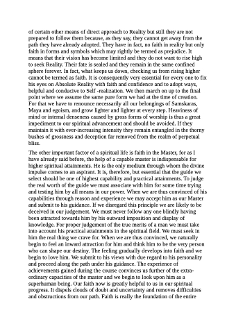 The other important factor of a spiritual life is faith in the Master, for as I have already said before, the help of a capable master is indispensable for higher spiritual attainments. He is the only medium through whom the divine impulse comes to an aspirant. It is, therefore, but essential that the guide we select should be one of highest capability and practical attainments. To judge the real worth of the guide we must associate with him for some time trying and testing him by all means in our power. When we are thus convinced of his capabilities through reason and experience we may accept him as our Master and submit to his guidance. If we disregard this principle we are likely to be deceived in our judgement. We must never follow any one blindly having been attracted towards him by his outward imposition and display of knowledge. For proper judgement of the true merits of a man we must take into account his practical attainments in the spiritual field. We must seek in him the real thing we crave for. When we are thus convinced, we naturally begin to feel an inward attraction for him and think him to be the very person who can shape our destiny. The feeling gradually develops into faith and we begin to love him. We submit to his views with due regard to his personality and proceed along the path under his guidance. The experience of achievements gained during the course convinces us further of the extra- ordinary capacities of the master and we begin to look upon him as a superhuman being. Our faith now is greatly helpful to us in our spiritual progress. It dispels clouds of doubt and uncertainty and removes difficulties and obstructions from our path. Faith is really the foundation of the entire