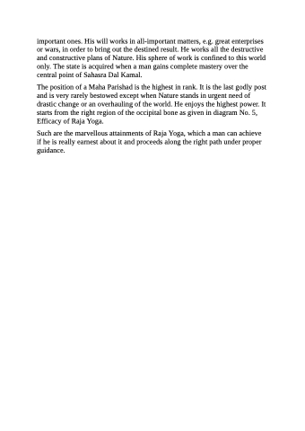 The position of a Maha Parishad is the highest in rank. It is the last godly post and is very rarely bestowed except when Nature stands in urgent need of drastic change or an overhauling of the world. He enjoys the highest power. It starts from the right region of the occipital bone as given in diagram No. 5, Efficacy of Raja Yoga.