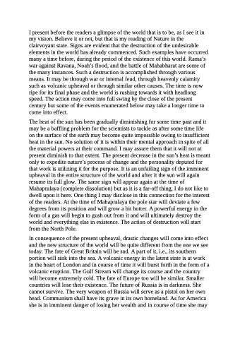 I present before the readers a glimpse of the world that is to be, as I see it in my vision. Believe it or not, but that is my reading of Nature in the clairvoyant state. Signs are evident that the destruction of the undesirable elements in the world has already commenced. Such examples have occurred many a time before, during the period of the existence of this world. Rama’s war against Ravana, Noah’s flood, and the battle of Mahabharat are some of the many instances. Such a destruction is accomplished through various means. It may be through war or internal feud, through heavenly calamity such as volcanic upheaval or through similar other causes. The time is now ripe for its final phase and the world is rushing towards it with headlong speed. The action may come into full swing by the close of the present century but some of the events enumerated below may take a longer time to come into effect.