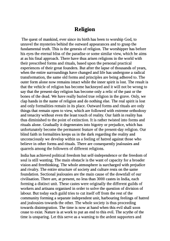 The quest of mankind, ever since its birth has been to worship God, to unravel the mysteries behind the outward appearances and to grasp the fundamental truth. This is the genesis of religion. The worshipper has before his eyes the eternal bliss of the paradise or some similar view, which he aims at as his final approach. There have thus arisen religions in the world with their prescribed forms and rituals, based upon the personal practical experiences of their great founders. But after the lapse of thousands of years, when the entire surroundings have changed and life has undergone a radical transformation, the same old forms and principles are being adhered to. The outer form alone now remains intact while the inner spirit is lost. The result is that the vehicle of religion has become hackneyed and it will not be wrong to say that the present-day religion has become only a relic of the past or the bones of the dead. We have really buried true religion in the grave. Only, we clap hands in the name of religion and do nothing else. The real spirit is lost and only formalities remain in its place. Outward forms and rituals are only things that remain open to view, which are followed with extreme orthodoxy and tenacity without even the least touch of reality. Our faith in reality has thus diminished to the point of extinction. It is rather twisted into forms and rituals alone. Gradually it degenerates into bigotry or prejudice, which has unfortunately become the permanent feature of the present-day religion. Our blind faith in formalities keeps us in the dark regarding the reality and unconsciously we develop within us a feeling of hatred against those who believe in other forms and rituals. There are consequently jealousies and quarrels among the followers of different religions.