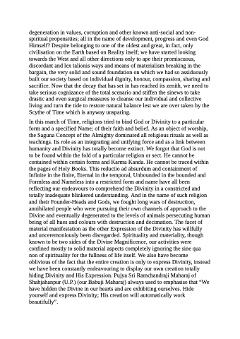 In this march of Time, religions tried to bind God or Divinity to a particular form and a specified Name; of their faith and belief. As an object of worship, the Saguna Concept of the Almighty dominated all religious rituals as well as teachings. Its role as an integrating and unifying force and as a link between humanity and Divinity has totally become extinct. We forgot that God is not to be found within the fold of a particular religion or sect. He cannot be contained within certain forms and Karma Kanda. He cannot be traced within the pages of Holy Books. This reductio ad absurdum and containment of Infinite in the finite, Eternal in the temporal, Unbounded in the bounded and Formless and Nameless into a restricted form and name have all been reflecting our endeavours to comprehend the Divinity in a constricted and totally inadequate blinkered understanding. And in the name of such religion and their Founder-Heads and Gods, we fought long wars of destruction, annihilated people who were pursuing their own channels of approach to the Divine and eventually degenerated to the levels of animals persecuting human being of all hues and colours with destruction and decimation. The facet of material manifestation as the other Expression of the Divinity has willfully and unceremoniously been disregarded. Spirituality and materiality, though known to be two sides of the Divine Magnificence, our activities were confined mostly to solid material aspects completely ignoring the sine qua non of spirituality for the fullness of life itself. We also have become oblivious of the fact that the entire creation is only to express Divinity, instead we have been constantly endeavouring to display our own creation totally hiding Divinity and His Expression. Pujya Sri Ramchandraji Maharaj of Shahjahanpur (U.P.) (our Babuji Maharaj) always used to emphasise that “We have hidden the Divine in our hearts and are exhibiting ourselves. Hide yourself and express Divinity; His creation will automatically work beautifully”.
