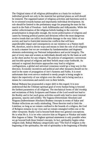 The Original status of all religious philosophies as a basis for exclusive individual growth not only in the material but spiritual planes as well should be restored. The organised nature of religious activities and functions need to be re-oriented towards human and importantly individual development. Its role should be limited to the preliminary stage for preparing the man for his march in the Path of Freedom - both Adibhautika and Adhyatmika. While the earlier collectivisation of the religious beliefs leading to the coercive proselytisation is despicable enough, the recent politicisation of religions and castes by forming political parties and divisions reflect the most dangerous erosive trends that can inflict incalculable damage to the very fabric of our society and lead to fratricidal internecine conflicts that will have unpredictable impact and consequences on our existence as a Nation itself. We, therefore, need to devise ways and means to limit the role of all religions in such a manner lest we are overtaken by fundamentalists and dogmatic elements undermining our National independence and social integrity. The part of every man and women as individuals should only be the basis as well as the sheet anchor for any religion. The policies of antagonistic conversions and forcible spread of religions and their beliefs must cease forthwith. As national or regional doctrinaire approaches may lead to religious conflagrations, a global and universal consensus would go a long way in this direction. Economic incentives and political and other measures should not be used in the name of propagation of one’s Systems and Faiths. It is most unfortunate that even service rendered to needy people is being sought to depict the superiority of one religion over the other and is being used as a means for conversions and switch over in their beliefs.