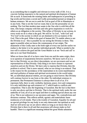 us as something that is tangible and relevant in every walk of life. It is a concrete feeling responsive to the natural and spiritual development of human life as such. It transcends the existing limits and inadequacies of preaching in big words and becomes a social and Godly personalised pursuit as integral to human existence. We are not to seek the God as goal of life in Himalayas or in any form. That is not the God we want; that is not the personality we are seeking. The God that modern man wants is the One who is with him all the time, who keeps company with him and who gives inspiration to work for others as an obligation to the society. This influx of Divinity in our actions, in every work we do is what is the goal. We will be ‘In God’, ‘with God’ and ‘For God’ in the society in which we are destined to live as trustees of the God. This is the goal. What is the goal of human life? To enable others to see the Divinity in us - this is possible by our seeing the Divinity in them. This again is possible when we know the commonness of our origin. The attainment of this Godly state is the birth right of every one and the earlier we realise it, the better it is for quicker individual growth. What is needed is the iron will to achieve the goal and the Great Master is at our “beck and call’ to take us to our final Destination.