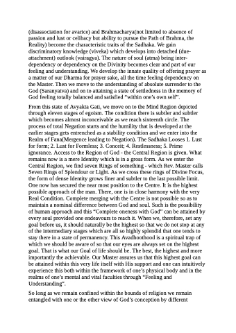 From this state of Avyakta Gati, we move on to the Mind Region depicted through eleven stages of egoism. The condition there is subtler and subtler which becomes almost inconceivable as we reach sixteenth circle. The process of total Negation starts and the humility that is developed at the earlier stages gets entrenched as a stability condition and we enter into the Realm of Fana(Mergence leading to Negation). The Sadhaka Looses 1. Lust for form; 2. Lust for Formless; 3. Conceit; 4. Restlessness; 5. Prime ignorance. Access to the Region of God - the Central Region is given. What remains now is a mere Identity which is in a gross form. As we enter the Central Region, we find seven Rings of something - which Rev. Master calls Seven Rings of Splendour or Light. As we cross these rings of Divine Focus, the form of dense Identity grows finer and subtler to the last possible limit. One now has secured the near most position to the Centre. It is the highest possible approach of the man. There, one is in close harmony with the very Real Condition. Complete merging with the Centre is not possible so as to maintain a nominal difference between God and soul. Such is the possibility of human approach and this “Complete oneness with God” can be attained by every soul provided one endeavours to reach it. When we, therefore, set any goal before us, it should naturally be the highest so that we do not stop at any of the intermediary stages which are all so highly splendid that one tends to stay there in a state of permanency. This Avadhoothood is a spiritual trap of which we should be aware of so that our eyes are always set on the highest goal. That is what our Goal of life should be. The best, the highest and more importantly the achievable. Our Master assures us that this highest goal can be attained within this very life itself with His support and one can intuitively experience this both within the framework of one’s physical body and in the realms of one’s mental and vital faculties through “Feeling and Understanding”.