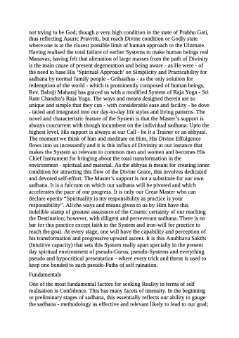 not trying to be God; though a very high condition in the state of Prabhu Gati, thus reflecting Asuric Pravritti, but reach Divine condition or Godly state where one is at the closest possible limit of human approach to the Ultimate. Having realised the total failure of earlier Systems to make human beings real Manavas; having felt that alienation of large masses from the path of Divinity is the main cause of present degeneration and being aware - as He were - of the need to base His ‘Spiritual Approach’ on Simplicity and Practicability for sadhana by normal family people - Grihasthas - as the only solution for redemption of the world - which is prominently composed of human beings, Rev. Babuji Maharaj has graced us with a modified System of Raja Yoga - Sri Ram Chandra’s Raja Yoga. The ways and means designed therein are so unique and simple that they can - with considerable ease and facility - be dove - tailed and integrated into our day-to-day life styles and living patterns. The novel and characteristic feature of the System is that the Master’s support is always concurrent with though incumbent on the individual sadhana. Upto the highest level, His support is always at our Call - be it a Trainer or an abhyasi. The moment we think of him and meditate on Him, His Divine Effulgence flows into us incessantly and it is this influx of Divinity at our instance that makes the System so relevant to common men and women and becomes His Chief Instrument for bringing about the total transformation in the environment - spiritual and material. As the abhyas is meant for creating inner condition for attracting this flow of the Divine Grace, this involves dedicated and devoted self-effort. The Master’s support is not a substitute for our own sadhana. It is a fulcrum on which our sadhana will be pivoted and which accelerates the pace of our progress. It is only our Great Master who can declare openly “Spirituality is my responsibility as practice is your responsibility”. All the ways and means given to us by Him have this indelible stamp of greatest assurance of the Cosmic certainty of our reaching the Destination; however, with diligent and perseverant sadhana. There is no bar for this practice except faith in the System and iron-will for practice to reach the goal. At every stage, one will have the capability and perception of his transformation and progressive upward ascent. It is this Anubhava Sakthi (Intuitive capacity) that sets this System really apart specially in the present day spiritual environment of pseudo-Gurus, pseudo-Systems and everything pseudo and hypocritical presentation - where every trick and threat is used to keep one bonded to such pseudo-Paths of self ruination.