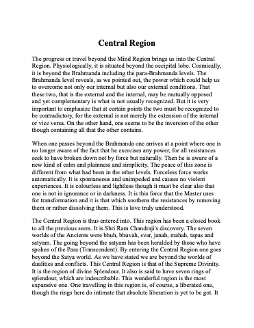 The Central Region is thus entered into. This region has been a closed book to all the previous seers. It is Shri Ram Chandraji's discovery. The seven worlds of the Ancients were bhuh, bhuvah, svar, janah, mahah, tapas and satyam. The going beyond the satyam has been heralded by those who have spoken of the Para (Transcendent). By entering the Central Region one goes beyond the Satya world. As we have stated we are beyond the worlds of dualities and conflicts. This Central Region is that of the Supreme Divinity. It is the region of divine Splendour. It also is said to have seven rings of splendour, which are indescribable. This wonderful region is the most expansive one. One travelling in this region is, of course, a liberated one, though the rings here do intimate that absolute liberation is yet to be got. It