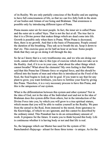 So far as I know that is a very troublesome one, and we who are doing our work, cannot afford to take to this type of exercise which does not take us to the Reality. And, if it is so in your case, what about the other things which cannot breathe? What about the elements? My own feeling is that Master said that this Prana has Ultimate force or original force, and this should be offered into the hearts of men and when this is introduced as the Food of the Soul, the Soul begins to look up for its goal. If you want to say that for any plant to grow, you want fertilisers, you have to fertilise your Soul by giving this Prana. Therefore, it is a very necessary process to have this Prana, and this is the uniqueness of our system.