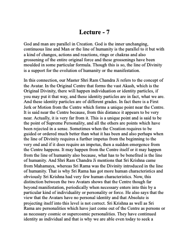 In this connection, our Master Shri Ram Chandra Ji refers to the concept of the Avatar. In the Original Centre that forms the vast Akash, which is the Original Divinity, there will happen individuation or identity particles, if you may put it that way, and these identity particles are in fact, what we are. And these identity particles are of different grades. In fact there is a First Jerk or Motion from the Centre which forms a unique point near the Centre. It is said near the Centre because, from this distance it appears to be very near. Actually, it is very far from it. This is a unique point and is said to be the point of Supreme Personality, and all the others are points which have been rejected in a sense. Sometimes when the Creation requires to be guided or ordered much better than what it has been and also perhaps when the line of Divinity requires a further impetus from the beginning to the very end and if it does require an impetus, then a sudden emergence from the Centre happens. It may happen from the Centre itself or it may happen from the line of humanity also because, what has to be benefited is the line of humanity. And Shri Ram Chandra Ji mentions that Sri Krishna came from Mahamaya, whereas Sri Rama was the Divinity introduced in the line of humanity. That is why Sri Rama has got more human characteristics and obviously Sri Krishna had very few human characteristics. Now, this distinction between the two Avatars shows that the Centre though far beyond manifestation, periodically when necessary enters into this by a particular kind of individuality or personality or force. He also says that the view that the Avatars have no personal identity and that Absolute is projecting itself into this level is not correct. Sri Krishna as well as Sri Rama are personalities which have just come out of the Centre as persons or as necessary cosmic or supercosmic personalities. They have continued identity as individual and that is why we are able even today to seek a
