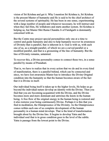 Our individual being itself is taken up to the higher levels, He helps us go beyond the individual nature develop an identity with the Divine. Then you find that you are becoming acquainted with the Divine, and the Divine becomes more and more dominant and untwines the knots in the human being. A free flow of the original energy in the human being is restored and it also restores your being continuously Divine. Perhaps it is this that you find in meditation, the Omnipresence of the Divinity. As the Omnipresence comes within each one of us complete development of the human personality in a human mind develops. That is the kind of transformation brought about by the Divine line. It begins to develop Yatra and the individual soul that is in gross condition goes to the level of the subtle. Yatra is passage from the lowest point to the Divine.