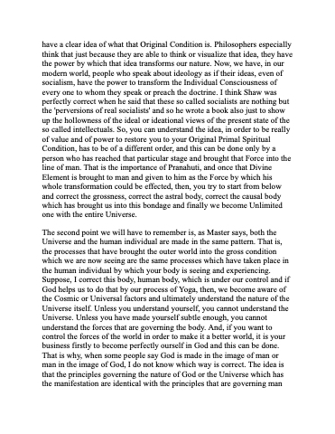 have a clear idea of what that Original Condition is. Philosophers especially think that just because they are able to think or visualize that idea, they have the power by which that idea transforms our nature. Now, we have, in our modern world, people who speak about ideology as if their ideas, even of socialism, have the power to transform the Individual Consciousness of every one to whom they speak or preach the doctrine. I think Shaw was perfectly correct when he said that these so called socialists are nothing but the 'perversions of real socialists' and so he wrote a book also just to show up the hollowness of the ideal or ideational views of the present state of the so called intellectuals. So, you can understand the idea, in order to be really of value and of power to restore you to your Original Primal Spiritual Condition, has to be of a different order, and this can be done only by a person who has reached that particular stage and brought that Force into the line of man. That is the importance of Pranahuti, and once that Divine Element is brought to man and given to him as the Force by which his whole transformation could be effected, then, you try to start from below and correct the grossness, correct the astral body, correct the causal body which has brought us into this bondage and finally we become Unlimited one with the entire Universe.