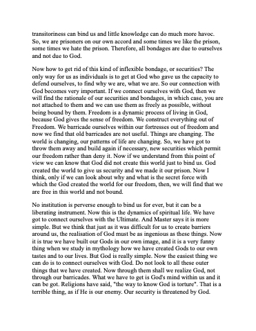 Now how to get rid of this kind of inflexible bondage, or securities? The only way for us as individuals is to get at God who gave us the capacity to defend ourselves, to find why we are, what we are. So our connection with God becomes very important. If we connect ourselves with God, then we will find the rationale of our securities and bondages, in which case, you are not attached to them and we can use them as freely as possible, without being bound by them. Freedom is a dynamic process of living in God, because God gives the sense of freedom. We construct everything out of Freedom. We barricade ourselves within our fortresses out of freedom and now we find that old barricades are not useful. Things are changing. The world is changing, our patterns of life are changing. So, we have got to throw them away and build again if necessary, new securities which permit our freedom rather than deny it. Now if we understand from this point of view we can know that God did not create this world just to bind us. God created the world to give us security and we made it our prison. Now I think, only if we can look about why and what is the secret force with which the God created the world for our freedom, then, we will find that we are free in this world and not bound.