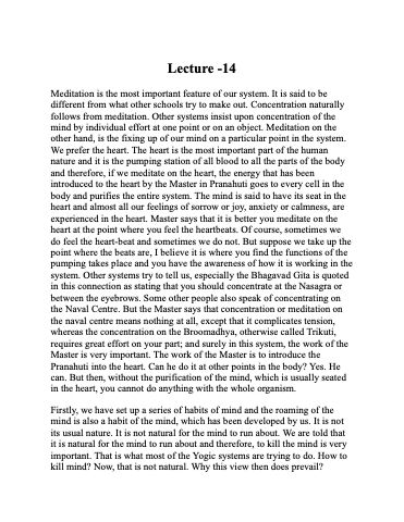 Meditation is the most important feature of our system. It is said to be different from what other schools try to make out. Concentration naturally follows from meditation. Other systems insist upon concentration of the mind by individual effort at one point or on an object. Meditation on the other hand, is the fixing up of our mind on a particular point in the system. We prefer the heart. The heart is the most important part of the human nature and it is the pumping station of all blood to all the parts of the body and therefore, if we meditate on the heart, the energy that has been introduced to the heart by the Master in Pranahuti goes to every cell in the body and purifies the entire system. The mind is said to have its seat in the heart and almost all our feelings of sorrow or joy, anxiety or calmness, are experienced in the heart. Master says that it is better you meditate on the heart at the point where you feel the heartbeats. Of course, sometimes we do feel the heart-beat and sometimes we do not. But suppose we take up the point where the beats are, I believe it is where you find the functions of the pumping takes place and you have the awareness of how it is working in the system. Other systems try to tell us, especially the Bhagavad Gita is quoted in this connection as stating that you should concentrate at the Nasagra or between the eyebrows. Some other people also speak of concentrating on the Naval Centre. But the Master says that concentration or meditation on the naval centre means nothing at all, except that it complicates tension, whereas the concentration on the Broomadhya, otherwise called Trikuti, requires great effort on your part; and surely in this system, the work of the Master is very important. The work of the Master is to introduce the Pranahuti into the heart. Can he do it at other points in the body? Yes. He can. But then, without the purification of the mind, which is usually seated in the heart, you cannot do anything with the whole organism.