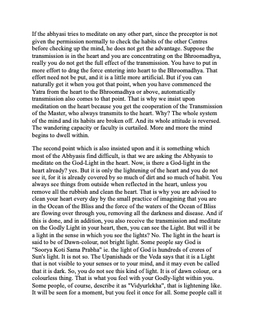 If the abhyasi tries to meditate on any other part, since the preceptor is not given the permission normally to check the habits of the other Centres before checking up the mind, he does not get the advantage. Suppose the transmission is in the heart and you are concentrating on the Bhroomadhya, really you do not get the full effect of the transmission. You have to put in more effort to drag the force entering into heart to the Bhroomadhya. That effort need not be put, and it is a little more artificial. But if you can naturally get it when you got that point, when you have commenced the Yatra from the heart to the Bhroomadhya or above, automatically transmission also comes to that point. That is why we insist upon meditation on the heart because you get the cooperation of the Transmission of the Master, who always transmits to the heart. Why? The whole system of the mind and its habits are broken off. And its whole attitude is reversed. The wandering capacity or faculty is curtailed. More and more the mind begins to dwell within.