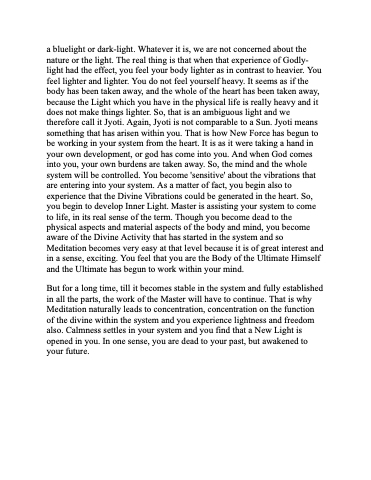 a bluelight or dark-light. Whatever it is, we are not concerned about the nature or the light. The real thing is that when that experience of Godly- light had the effect, you feel your body lighter as in contrast to heavier. You feel lighter and lighter. You do not feel yourself heavy. It seems as if the body has been taken away, and the whole of the heart has been taken away, because the Light which you have in the physical life is really heavy and it does not make things lighter. So, that is an ambiguous light and we therefore call it Jyoti. Again, Jyoti is not comparable to a Sun. Jyoti means something that has arisen within you. That is how New Force has begun to be working in your system from the heart. It is as it were taking a hand in your own development, or god has come into you. And when God comes into you, your own burdens are taken away. So, the mind and the whole system will be controlled. You become 'sensitive' about the vibrations that are entering into your system. As a matter of fact, you begin also to experience that the Divine Vibrations could be generated in the heart. So, you begin to develop Inner Light. Master is assisting your system to come to life, in its real sense of the term. Though you become dead to the physical aspects and material aspects of the body and mind, you become aware of the Divine Activity that has started in the system and so Meditation becomes very easy at that level because it is of great interest and in a sense, exciting. You feel that you are the Body of the Ultimate Himself and the Ultimate has begun to work within your mind.