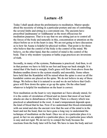 Today I shall speak about the preliminaries to meditation. Master speaks about the necessity of sitting in a particular posture and one of controlling the several limbs and sitting in a convenient one. The ancients have prescribed 'padmasana' or 'siddhasana' as the most efficacious for meditation purposes. That is to say that we are sitting just as to control all the forces of the body and naturally in this, concentration or attention on the object before us or in the heart is easy. We are not going to have discussion as to how far Asana is helpful for physical welfare. That point is for those who believe that the control of the body is the control of the mind. We believe, on the other hand, that the control of mind is the control of the body. That is why modern vyayama or hatha yoga practices are inversions of truth.