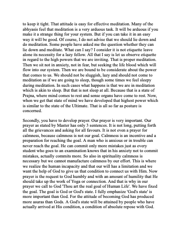Secondly, you have to develop prayer. Our prayer is very important. Our prayer as stated by Master has only 3 sentences. It is not long, putting forth all the grievances and asking for all favours. It is not even a prayer for calmness, because calmness is not our goal. Calmness is an incentive and a preparation for reaching the goal. A man who is anxious or in trouble can never reach the goal. He can commit only more mistakes just as every student who goes to an examination knows that in his anxiety not to commit mistakes, actually commits more. So also in spirituality calmness is necessary but we cannot manufacture calmness by our effort. This is where we realize the human incapacity and that our will has a limitation and we want the help of God to give us that condition to connect us with Him. Now prayer is the request to God humbly and with an amount of humility that He should take up the work of Yoga or connection. And that is why in our prayer we call to God 'Thou art the real goal of Human Life'. We have fixed the goal. The goal is God or God's state. I fully emphasize 'God's state' is more important than God. For the attitude of becoming God has produced more asuras than Gods. A God's state will be attained by people who have actually arrived at His condition, a condition of absolute repose with God.