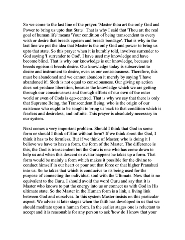 So we come to the last line of the prayer. 'Master thou art the only God and Power to bring us upto that State'. That is why I said that 'Thou art the real goal of human life' means 'Your condition of being transcendent to every wish or desire that breeds egoism and breeds bondage'. That is why in the last line we put the idea that Master is the only God and power to bring us upto that state. So this prayer when it is humbly told, involves surrender to God saying 'I surrender to God'. I have used my knowledge and have become blind. That is why our knowledge is our knowledge, because it breeds egoism it breeds desire. Our knowledge today is subservient to desire and instrument to desire, even as our consciousness. Therefore, this must be abandoned and we cannot abandon it merely by saying 'I have abandoned it'. Sloth is not equal to consciousness. Our giving up action does not produce liberation, because the knowledge which we are getting through our consciousness and through efforts of our own of the outer world or even of Gods is ego-centred. That is why we say that there is only that Supreme Being, the Transcendent Being, who is the origin of our existence who ought to be sought to bring us back to that condition which is fearless and desireless, and infinite. This prayer is absolutely necessary in our system.