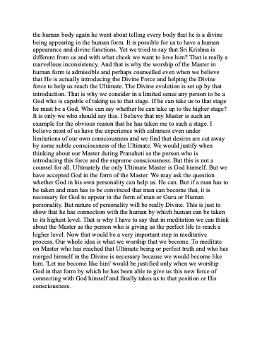 the human body again he went about telling every body that he is a divine being appearing in the human form. It is possible for us to have a human appearance and divine functions. Yet we tried to say that Sri Krishna is different from us and with what cheek we want to love him? That is really a marvellous inconsistency. And that is why the worship of the Master in human form is admissible and perhaps counselled even when we believe that He is actually introducing the Divine Force and helping the Divine force to help us reach the Ultimate. The Divine evolution is set up by that introduction. That is why we consider in a limited sense any person to be a God who is capable of taking us to that stage. If he can take us to that stage he must be a God. Who can say whether he can take up to the higher stage? It is only we who should say this. I believe that my Master is such an example for the obvious reason that he has taken me to such a stage. I believe most of us have the experience with calmness even under limitations of our own consciousness and we find that desires are cut away by some subtle consciousness of the Ultimate. We would justify when thinking about our Master during Pranahuti as the person who is introducing this force and the supreme consciousness. But this is not a counsel for all. Ultimately the only Ultimate Master is God himself. But we have accepted God in the form of the Master. We may ask the question whether God in his own personality can help us. He can. But if a man has to be taken and man has to be convinced that man can become that, it is necessary for God to appear in the form of man or Guru or Human personality. But nature of personality will be really Divine. This is just to show that he has connection with the human by which human can be taken to its highest level. That is why I have to say that in meditation we can think about the Master as the person who is giving us the perfect life to reach a higher level. Now that would be a very important step in meditative process. Our whole idea is what we worship that we become. To meditate on Master who has reached that Ultimate being or perfect truth and who has merged himself in the Divine is necessary because we would become like him. 'Let me become like him' would be justified only when we worship God in that form by which he has been able to give us this new force of connecting with God himself and finally takes us to that position or His consciousness.
