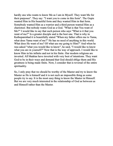 So, I only pray that we should be worthy of the Master and try to know the Master as He is himself and it is not such an impossible thing as some people try to say. It is the most easy thing to know the Master in Himself. But we are very much interested in the relationship of God as between us and Himself rather than the Master.