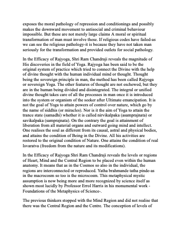 In the Efficacy of Rajyoga, Shri Ram Chandraji reveals the magnitude of His discoveries in the field of Yoga. Rajyoga has been said to be the original system of practice which tried to connect the Divine with the help of divine thought with the human individual mind or thought. Thought being the sovereign principle in man, the method has been called Rajyoga or sovereign Yoga. The other features of thought are not eschewed, but they are in the human being divided and disintegrated. The integral or unified divine thought takes care of all the processes in man once it is introduced into the system or organism of the seeker after Ultimate emancipation. It is not the goal of Yoga to attain powers of control over nature, which go by the name of siddhis (or miracles). Nor is it the aim of Yoga to attain the trance state (samadhi) whether it is called nirvikalpaka (asamprajnata) or savikalpaka (samprajnata). On the contrary the goal is attainment of liberation from all material organs and outward going mind and intellect. One realises the soul as different from its causal, astral and physical bodies, and attains the condition of Being in the Divine. All his activities are restored to the original condition of Nature. One attains the condition of real Isvaratva (freedom from the nature and its modifications).