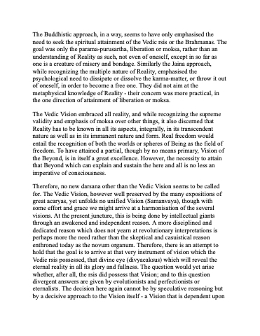 The Vedic Vision embraced all reality, and while recognizing the supreme validity and emphasis of moksa over other things, it also discerned that Reality has to be known in all its aspects, integrally, in its transcendent nature as well as in its immanent nature and form. Real freedom would entail the recognition of both the worlds or spheres of Being as the field of freedom. To have attained a partial, though by no means primary, Vision of the Beyond, is in itself a great excellence. However, the necessity to attain that Beyond which can explain and sustain the here and all is no less an imperative of consciousness.