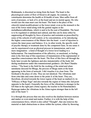 Brahmanda, is discerned as rising from the heart. The heart is the physiological centre of flow of blood to all organs. Its contents, or constituents determine the health or ill-health of men. Men suffer from all sorts of pressure, or lack of it, at the heart and are in mortal agony. He who would cure the man must cure his heart. The heart is the place of the cittavrtti (mind-modifications) or the lower mind, even as the stomach is the seat of the lower mind along with the genital organs or the muladharasvadhisthana, which is said to be the seat of Kundalini. The heart is to be regulated or subdued and calmed, and this can be done either by suppressing all thoughts by force of practice and restraints as prescribed by some of the schools of self-control, or by concentration, or by introducing the higher consciousness of the Master into the heart - a sort of injection to restore the inner peace and balance. It is, in other words, the specific work of psychic therapy or treatment done by the competent Guru. In one sense it can be experienced even as physical process in transmission, and is not mere imagination - a kind of thought of a lower level leading to a hallucination. The transformation of the affective, or emotional, or feeling state is the first step of this experience of transmission of the supramental or superfine consciousness into the heart. The flow of this force all through the body later reveals the lightness and also immateriality of the body felt during meditations under this transmissional guidance. (Sri Ram Chandra writes:- "The heart is the field for the working of the mind and when samskaras descend for Bhoga, the process of bhoga starts at the heart appearing in the form of network. I did visualise it in clear form. The forehead is the place of citta. They are not identical. The vibrations start from citta-lake and come down to the point A of the heart. They are, therefrom, diverted towards the lower region of the heart as marked (L) in "Efficacy of Raja Yoga" and also towards the region of Atma (the 2nd point opposite to the heart). Generally the force of the vibrations is stronger in the left than in the right part (Atma region); the teacher in Sri Ramchandra's Rajayoga makes the vibrations in the Atma region stronger than in the left side of the heart.")