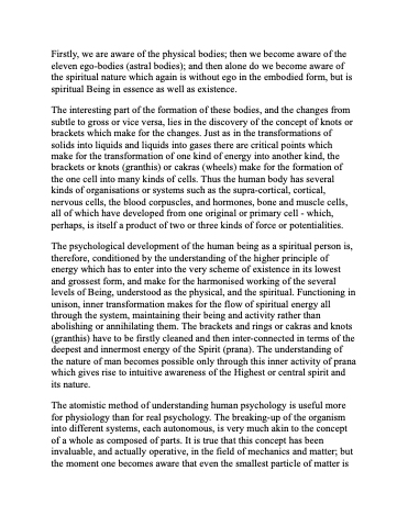 The interesting part of the formation of these bodies, and the changes from subtle to gross or vice versa, lies in the discovery of the concept of knots or brackets which make for the changes. Just as in the transformations of solids into liquids and liquids into gases there are critical points which make for the transformation of one kind of energy into another kind, the brackets or knots (granthis) or cakras (wheels) make for the formation of the one cell into many kinds of cells. Thus the human body has several kinds of organisations or systems such as the supra-cortical, cortical, nervous cells, the blood corpuscles, and hormones, bone and muscle cells, all of which have developed from one original or primary cell - which, perhaps, is itself a product of two or three kinds of force or potentialities.