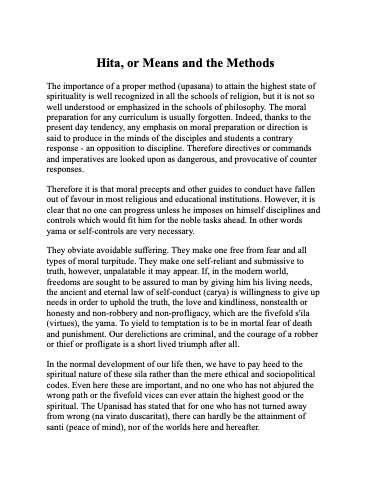 The importance of a proper method (upasana) to attain the highest state of spirituality is well recognized in all the schools of religion, but it is not so well understood or emphasized in the schools of philosophy. The moral preparation for any curriculum is usually forgotten. Indeed, thanks to the present day tendency, any emphasis on moral preparation or direction is said to produce in the minds of the disciples and students a contrary response - an opposition to discipline. Therefore directives or commands and imperatives are looked upon as dangerous, and provocative of counter responses.