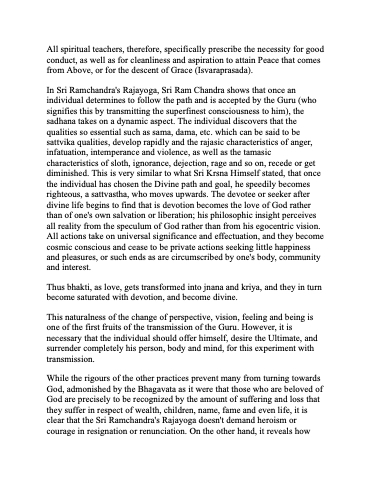 While the rigours of the other practices prevent many from turning towards God, admonished by the Bhagavata as it were that those who are beloved of God are precisely to be recognized by the amount of suffering and loss that they suffer in respect of wealth, children, name, fame and even life, it is clear that the Sri Ramchandra's Rajayoga doesn't demand heroism or courage in resignation or renunciation. On the other hand, it reveals how