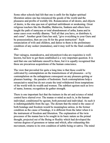 There is one important fact that the trainers in the art and science of mind control have slurred over. The manas or mind as such is, in the human individual, conditioned by egoism, both personal and individual. As such it is indistinguishable from the ego. The dictum that the mind is the cause of both bondage and freedom would be meaningless unless, in the former condition as the cause of bondage, it is different from the latter when it is the instrument of freedom and liberation. The explanation of the twin processes of the manas has to be sought in its basic nature as the primal thought, projected out of the Being or Reality which had developed the various degrees of grossness or tamas and which, after exhausting this movement, returns to its own condition of subtle being or sattva. The mind