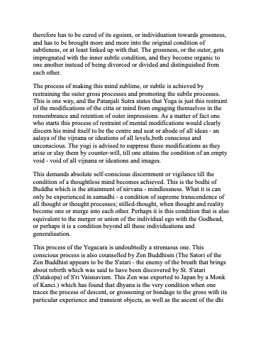This process of the Yogacara is undoubtedly a strenuous one. This conscious process is also counselled by Zen Buddhism (The Satori of the Zen Buddhist appears to be the S'atari - the enemy of the breath that brings about rebirth which was said to have been discovered by St. S'atari (S'atakopa) of S'ri Vaisnavism. This Zen was exported to Japan by a Monk of Kanci.) which has found that dhyana is the very condition when one traces the process of descent, or grossening or bondage to the gross with its particular experience and transient objects, as well as the ascent of the dhi