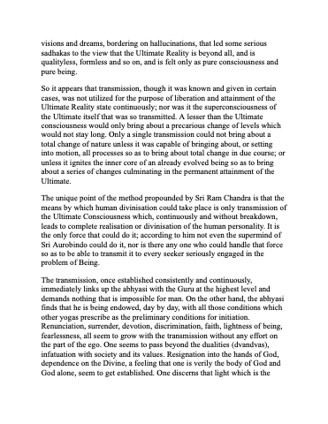 The unique point of the method propounded by Sri Ram Chandra is that the means by which human divinisation could take place is only transmission of the Ultimate Consciousness which, continuously and without breakdown, leads to complete realisation or divinisation of the human personality. It is the only force that could do it; according to him not even the supermind of Sri Aurobindo could do it, nor is there any one who could handle that force so as to be able to transmit it to every seeker seriously engaged in the problem of Being.