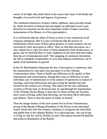 In the Sri Ramchandra's Rajayoga the line of preceptors is continuous, and the transmission by each and every preceptor is of the Ultimate Consciousness alone. There is hardly any difference in the quality of that transmission and consciousness, though there may be difference in each individual case of transmission as to the manner of operations in respect of cleaning, removing obstructions and uncovering the sheaths that had formed on the central core of being. This makes for the real continuous creation of divine men, or divinised men, by and through the transmission of the Ultimate Divine Being. It may also be observed that one becomes more aware of being, rather than knowing; one becomes filled with peace and fullness. There is thus the dawn of reality in oneself.