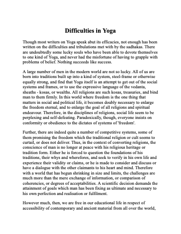 Though most writers on Yoga speak abut its efficacies, not enough has been written on the difficulties and tribulations met with by the sadhakas. There are undoubtedly some lucky souls who have been able to devote themselves to one kind of Yoga, and never had the misfortune of having to grapple with problems of belief. Nothing succeeds like success.