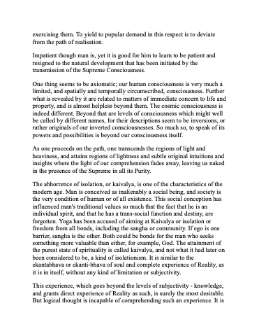 The abhorrence of isolation, or kaivalya, is one of the characteristics of the modern age. Man is conceived as inalienably a social being, and society is the very condition of human or of all existence. This social conception has influenced man's traditional values so much that the fact that he is an individual spirit, and that he has a trans-social function and destiny, are forgotten. Yoga has been accused of aiming at Kaivalya or isolation or freedom from all bonds, including the sangha or community. If ego is one barrier, sangha is the other. Both could be bonds for the man who seeks something more valuable than either, for example, God. The attainment of the purest state of spirituality is called kaivalya, and not what it had later on been considered to be, a kind of isolationism. It is similar to the ekantabhava or ekanti-bhava of soul and complete experience of Reality, as it is in itself, without any kind of limitation or subjectivity.