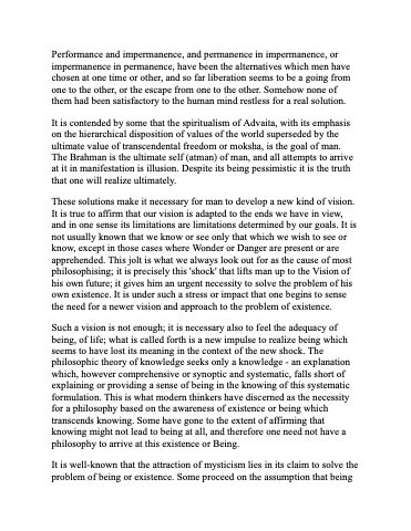 Performance and impermanence, and permanence in impermanence, or impermanence in permanence, have been the alternatives which men have chosen at one time or other, and so far liberation seems to be a going from one to the other, or the escape from one to the other. Somehow none of them had been satisfactory to the human mind restless for a real solution.