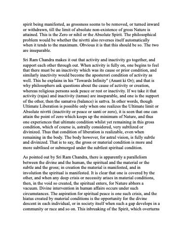Sri Ram Chandra makes it out that activity and inactivity go together, and support each other through out. When activity is fully on, one begins to feel that there must be an inactivity which was its cause or prior condition, and similarly inactivity would become the aposterori condition of activity as well. This he explains in his "Towards Infinity" (Anant ki Or); and that is why philosophers ask questions about the cause of activity or creation, whereas religious persons seek peace or rest or inactivity. If we take it that activity (rajas) and inactivity (tamas) are inseparable, and one is the support of the other, then the samatva (balance) is sattva. In other words, though Ultimate Liberation is possible only when one realizes the Ultimate limit or Absolute nivrtti (inactivity or peace or santi or zero), it is seen that one can attain the point of zero which keeps up the minimum of Nature, and thus one experiences that ultimate condition whilst yet remaining in this gross condition, which of course is, astrally considered, very subtlized or divinized. Thus that condition of liberation is realizable, even when remaining in the body. The body however, for astral vision, is fully subtle and divinized. That is to say, the gross or material condition is more and more subtlised or submerged under the subtlest spiritual condition.
