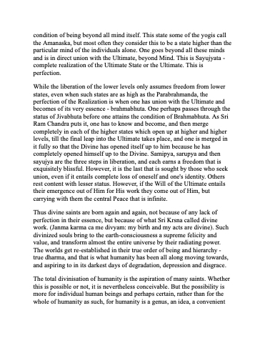 Thus divine saints are born again and again, not because of any lack of perfection in their essence, but because of what Sri Krsna called divine work. (Janma karma ca me divyam: my birth and my acts are divine). Such divinized souls bring to the earth-consciousness a supreme felicity and value, and transform almost the entire universe by their radiating power. The worlds get re-established in their true order of being and hierarchy - true dharma, and that is what humanity has been all along moving towards, and aspiring to in its darkest days of degradation, depression and disgrace.