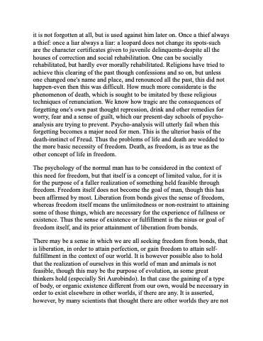it is not forgotten at all, but is used against him later on. Once a thief always a thief: once a liar always a liar: a leopard does not change its spots-such are the character certificates given to juvenile delinquents-despite all the houses of correction and social rehabilitation. One can be socially rehabilitated, but hardly ever morally rehabilitated. Religions have tried to achieve this clearing of the past though confessions and so on, but unless one changed one's name and place, and renounced all the past, this did not happen-even then this was difficult. How much more considerate is the phenomenon of death, which is sought to be imitated by these religious techniques of renunciation. We know how tragic are the consequences of forgetting one's own past thought repression, drink and other remedies for worry, fear and a sense of guilt, which our present-day schools of psycho- analysis are trying to prevent. Psycho-analysis will utterly fail when this forgetting becomes a major need for men. This is the ulterior basis of the death-instinct of Freud. Thus the problems of life and death are wedded to the more basic necessity of freedom. Death, as freedom, is as true as the other concept of life in freedom.