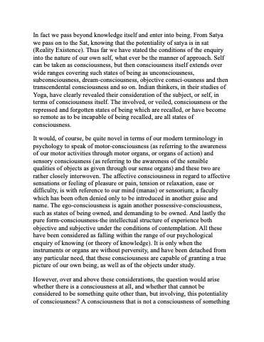 In fact we pass beyond knowledge itself and enter into being. From Satya we pass on to the Sat, knowing that the potentiality of satya is in sat (Reality Existence). Thus far we have stated the conditions of the enquiry into the nature of our own self, what ever be the manner of approach. Self can be taken as consciousness, but then consciousness itself extends over wide ranges covering such states of being as unconsciousness, subconsciousness, dream-consciousness, objective consci-ousness and then transcendental consciousness and so on. Indian thinkers, in their studies of Yoga, have clearly revealed their consideration of the subject, or self, in terms of consciousness itself. The involved, or veiled, consciousness or the repressed and forgotten states of being which are recalled, or have become so remote as to be incapable of being recalled, are all states of consciousness.
