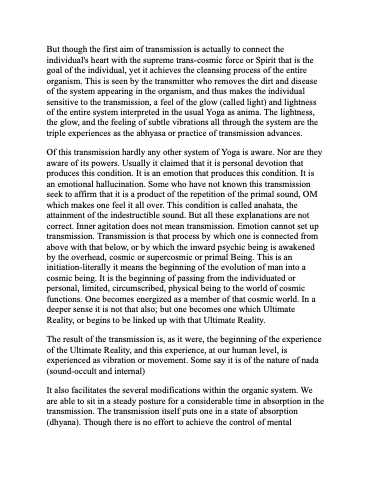 Of this transmission hardly any other system of Yoga is aware. Nor are they aware of its powers. Usually it claimed that it is personal devotion that produces this condition. It is an emotion that produces this condition. It is an emotional hallucination. Some who have not known this transmission seek to affirm that it is a product of the repetition of the primal sound, OM which makes one feel it all over. This condition is called anahata, the attainment of the indestructible sound. But all these explanations are not correct. Inner agitation does not mean transmission. Emotion cannot set up transmission. Transmission is that process by which one is connected from above with that below, or by which the inward psychic being is awakened by the overhead, cosmic or supercosmic or primal Being. This is an initiation-literally it means the beginning of the evolution of man into a cosmic being. It is the beginning of passing from the individuated or personal, limited, circumscribed, physical being to the world of cosmic functions. One becomes energized as a member of that cosmic world. In a deeper sense it is not that also; but one becomes one which Ultimate Reality, or begins to be linked up with that Ultimate Reality.