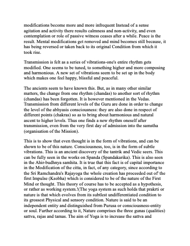 This is to show that even thought is in the form of vibrations, and can be shown to be of this nature. Consciousness, too, is in the form of subtle vibrations. This is an ancient discovery of the tantrik and Vedic seers. This can be fully seen in the works on Spanda (Spandakarika). This is also seen in the Ahir-budhnya samhita. It is true that this fact is of capital importance in the Modification of the citta, in fact, of any category, since according to the Sri Ramchandra's Rajayoga the whole creation has proceeded out of' the first Impulse (Ksobha) which is considered to be of the nature of the First Mind or thought. This theory of course has to be accepted as a hypothesis, or rather as working system.!(The yoga system as such holds that prakrti or nature is that which evolves from its subtlest undifferentiated condition to its grossest Physical and sensory condition. Nature is said to be an independent entity and distinguished from Purusa or consciousness-entity or soul. Further according to it, Nature comprises the three gunas (qualities) sattva, rajas and tamas. The aim of Yoga is to increase the sattva and