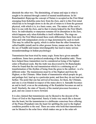 diminish the other two. The diminishing, of tamas and rajas is what is sought to be attained through control of mental modifications. In Sri Ramchandra's Rajayoga the concept of Nature is accepted as the First Mind emerging from Kshobha some how from the Zero, and it is this First mind which has to be brought down to do the job of return to it from the grossest physical, with which it is, in a basic sense, one. The nature of the soul is that it is one with the Zero, and to that it returns helped by the First Mind's force. Its individuality or manyness remains till its absorption in the Zero, which happens only when Kshobha is itself withdrawn. The rings are formed by the First Mind around these souls differentiate them from each other and with independent circles or rings determined by each in itself. This may be called the egoity, which is earlier than the other formations called buddhi (mind) and its other grosser forms, manas and citta. In fact the use of buddhi and manas interchangeably has lead to many serious misunderstandings in Indian psychology)