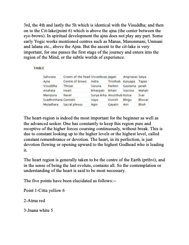 3rd, the 4th and lastly the 5h which is identical with the Visuddha; and then on to the Cit-lake(point 6) which is above the ajna (the center between the eye-brows). In spiritual development the ajna does not play any part. Some early Yogic works mentioned centres such as Manas, Manonmani, Unmani and lalana etc., above the Ajna. But the ascent to the cit-lake is very important, for one passes the first stage of the journey and enters into the region of the Mind, or the subtle worlds of experience.