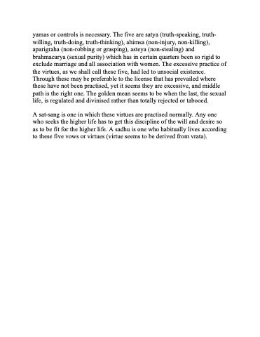 A sat-sang is one in which these virtues are practised normally. Any one who seeks the higher life has to get this discipline of the will and desire so as to be fit for the higher life. A sadhu is one who habitually lives according to these five vows or virtues (virtue seems to be derived from vrata).