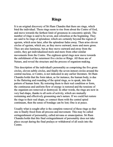 It is an original discovery of Sri Ram Chandra that there are rings, which bind the individual. These rings seem to rise from about the Centre of God, and move towards the farthest limit of grossness in concentric spirals. The number of rings is said to be seven, and colourless at the beginning. They are said to be rings of splendour, which are certainly beyond the region of egoism, which arise later, after the splendour fades away. Then arise eleven circles of egoism, which are, as they move outward, more and more gross. They are also luminous, but as they move outward and away from the centre, they get individualized more and more from other similar movements from the Centre. The eighteen spiral rings now move towards the enfoldment of the outermost five circles or Rings. All these are of Nature, and reveal the structure and the process of organism-making.