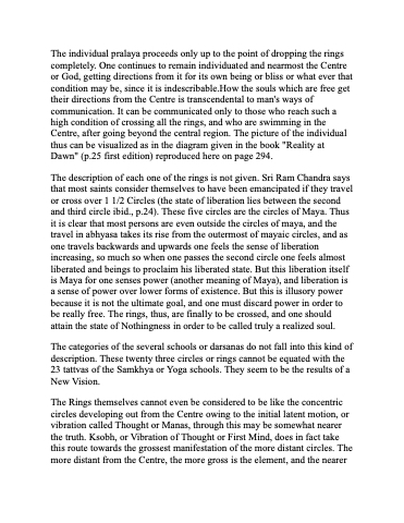 The description of each one of the rings is not given. Sri Ram Chandra says that most saints consider themselves to have been emancipated if they travel or cross over 1 1/2 Circles (the state of liberation lies between the second and third circle ibid., p.24). These five circles are the circles of Maya. Thus it is clear that most persons are even outside the circles of maya, and the travel in abhyasa takes its rise from the outermost of mayaic circles, and as one travels backwards and upwards one feels the sense of liberation increasing, so much so when one passes the second circle one feels almost liberated and beings to proclaim his liberated state. But this liberation itself is Maya for one senses power (another meaning of Maya), and liberation is a sense of power over lower forms of existence. But this is illusory power because it is not the ultimate goal, and one must discard power in order to be really free. The rings, thus, are finally to be crossed, and one should attain the state of Nothingness in order to be called truly a realized soul.