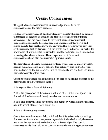 Cosmic consciousness has sometimes been said to be similar to some of the experiences of the Upanisadic seers :