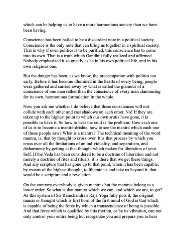 Now you ask me whether I do believe that these consciences will not collide with each other and cast shadows on each other. No! If they are taken up to the highest point to which our own srutis have gone, it is possible to have it. So how to hear the sruti is the problem. How each one of us is to become a mantra-drishta, how to see the mantra which each one of those people saw? What is a mantra? The technical meaning of the word mantra, is, that by thought to cross over. It is that process by which you cross over all the limitations of an individuality, and separatism, and disharmony by getting at that thought which makes for liberation of your Self. If the Veda has been considered to be a doctrine of liberation and not merely a doctrine of rites and rituals, it is there that we get these things. And any scripture that has gone up to that point, when it has been capable, by means of the highest thought, to liberate us and take us beyond it, that would be a scripture and a revelation.